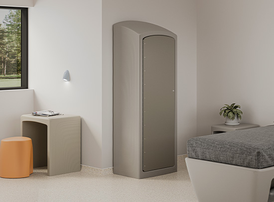 Der Ryno® Kleiderschrank mit Tür wurde speziell entwickelt, um sicheren Stauraum in Bereichen mit niedrigem bis mittlerem Risiko zu bieten – mit besonderem Fokus auf Langlebigkeit und Sicherheit. Er verfügt über eine warme, dunkelgraue Solid Grade Laminate (SGL)-Tür, die wasserbeständig, robust und hygienisch ist.